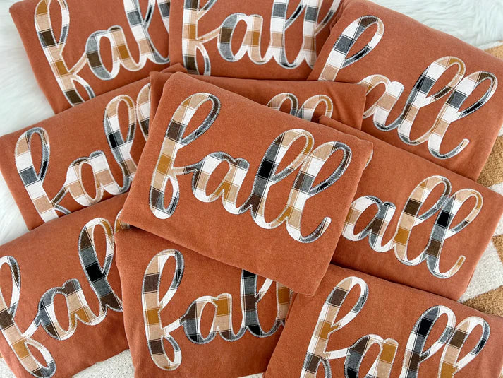 Celebrate the season with our adorable flannel tee or cozy crewneck, featuring the word "FALL" beautifully embroidered. Embrace autumn in style and comfort.